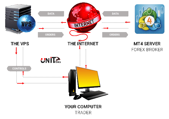 The map below explains how the connectivity between your computer, the VPS and the MT5 trading server gives you constant access.